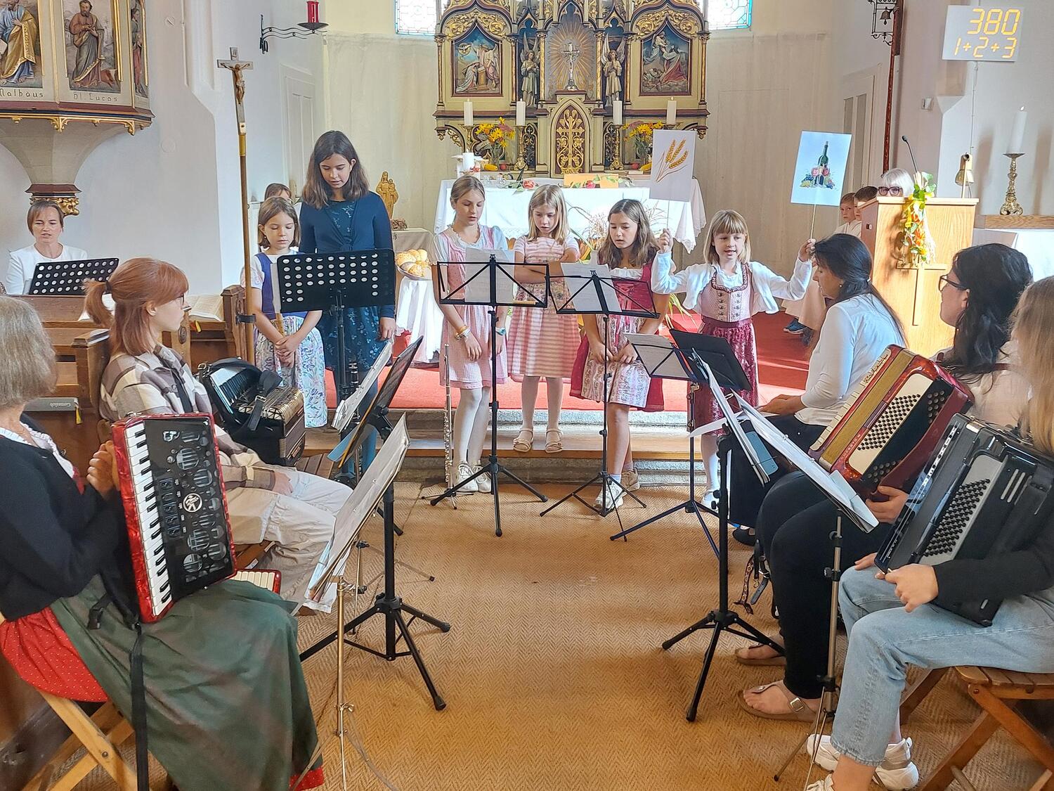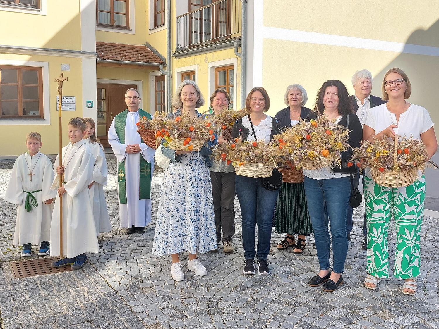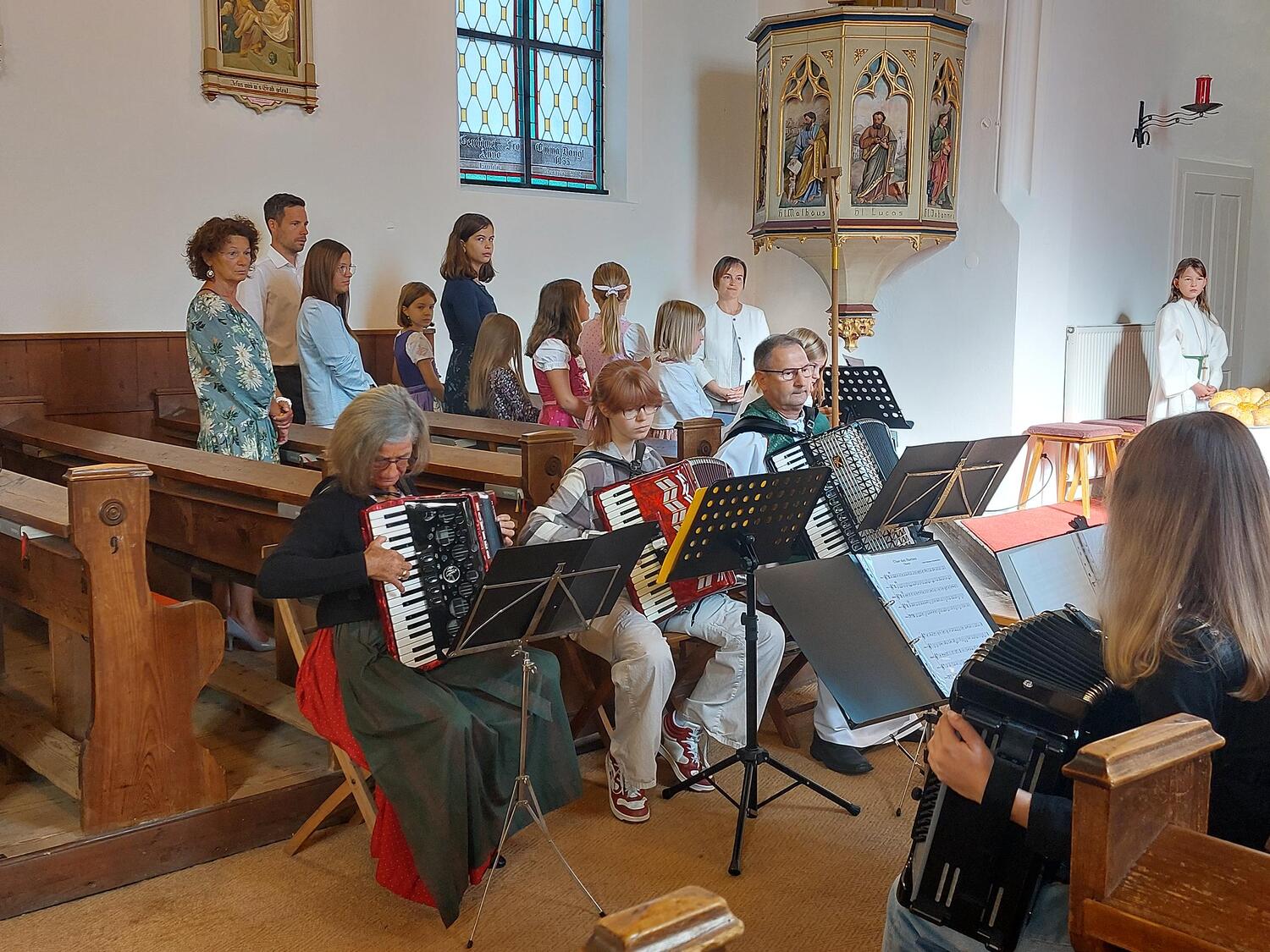 Am Sonntag, 21.09.2025 feierten wir Erntedank. Die Hl. Messe wurde von der Musikschule unter Leitung von Martina Wurz und dem Kirchenchor unter Leitung von Josefine Decker musikalisch gestaltet. Auch unser Pfarrer spielte mit dem Akkordeon beim Eingangslied mit. Im Anschluss wurden die gesegneten Erntedank-Sträußchen verteilt.